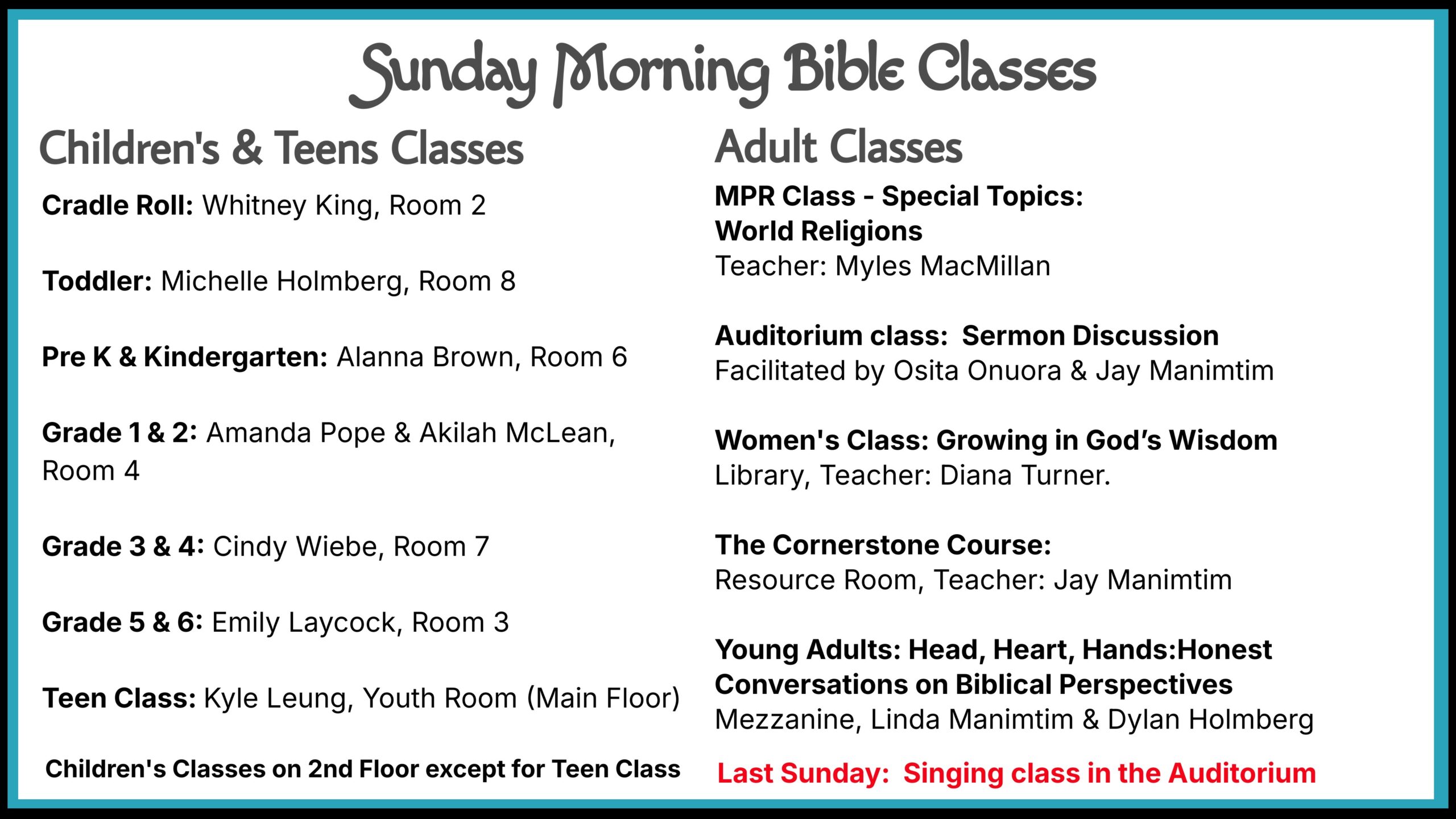 Sunday morning bible classes are available after our worship service at approximately 11:20 amĀ from September to June.